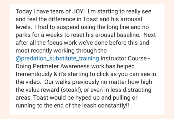 Before Predation Substitute Training, I was being dragged behind my dog while she was gleefully chasing. Thanks to your clear and concise protocols, I was able to show her how we can hunt together! She is so driven to play the games with me, and it has strengthened our relationship and communication.